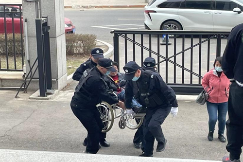 駐勤保安員為行動(dòng)不便的群眾抬輪椅